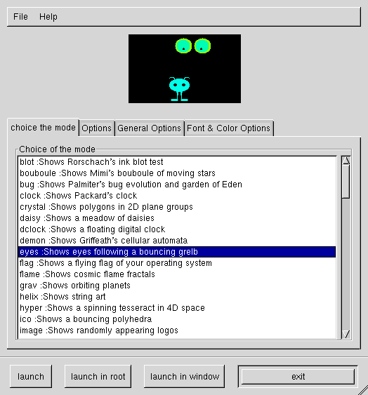 With this launcher you could configurate xlock(more) and launch it in a window, root window or