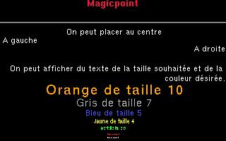 Il vient du monde BSD et a été developpé par des japonais. L'écriture d'une présentation Magic Point se fait via un langage dans un fichier texte dont nous verrons la syntaxe plus tard. Il est recommandé d'utiliser la bibliothèque FreeType bien que Apple détient un brevet américain sur les fontes trues types .