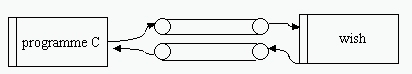 A l’origine TCL est un langage auquel on peut ajouter des instructions pour faire un langage proprietaire répondant a vos besoins. Mais cette ajout est peut aisé, et entraine le stockage de gros programme ( programme C + librairie TCL+TK ). Il y a pourtant un autre moyen de combiner des programmes C ou C++ avec du TK. En effet, on peut faire communiquer du C avec l’interpreteur TCL-TK(wish) grace à des tubes UNIX.